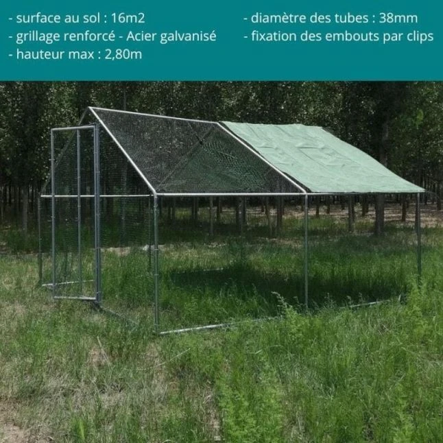 L’enclos grillagé pour poulailler est en effet livré avec une bâche vert forêt. Elle est prévue pour pouvoir recouvrir la moitié de la surface de la toiture. Elle permettra à vos volailles de se protéger de la pluie mais aussi du soleil.