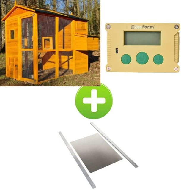 Il est proposé ici accompagné d’un portier électronique de marque zen Farm qui automatisera son ouverture et sa fermeture. Le kit contient également une trappe métallique à ouverture verticale pour une mise en place rapide.